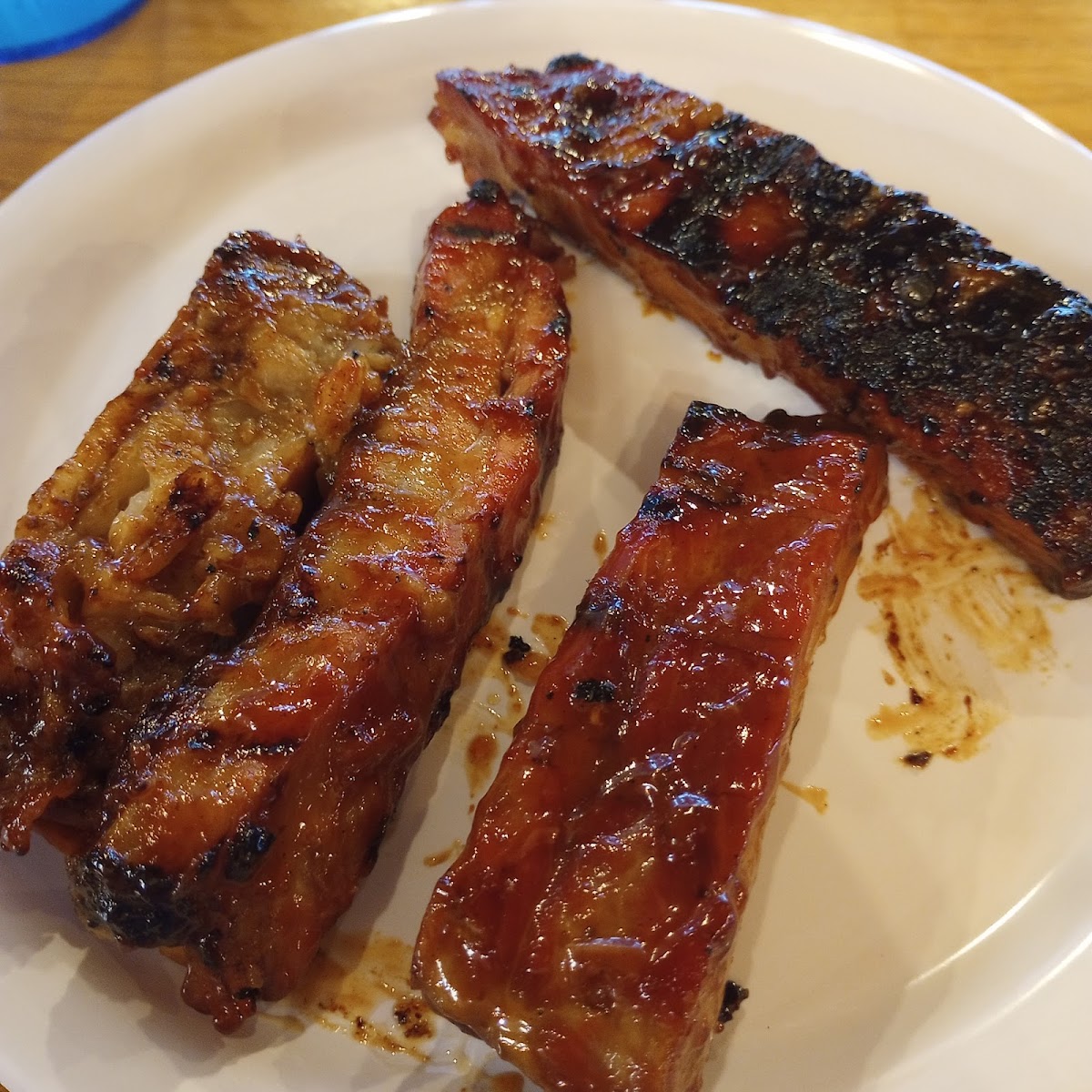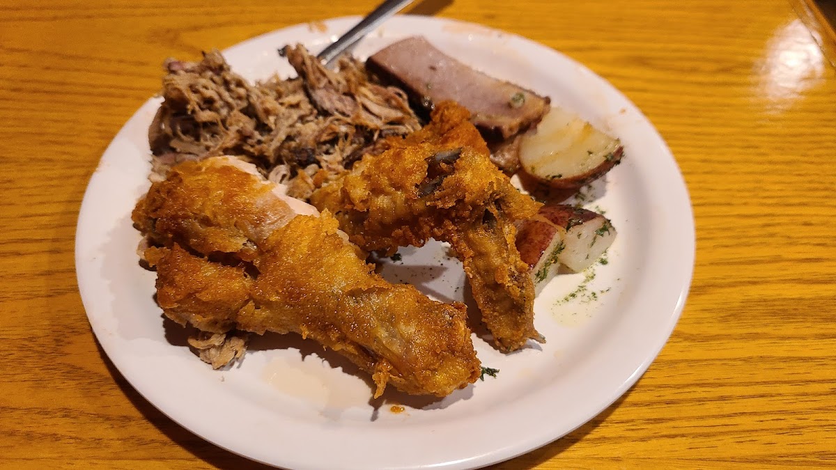 Solid 4 stars here. We were pleasantly surprised. While advertising as a BBQ, they have many options- including fried chicken and frog legs! The buffet includes a salad bar and hot menu items, with a decent selection. We didn't go hungry. They do fried chicken right. The dessert selection was also nice - anywhere with strawberry rhubarb is in good standing with me. The brisket was decent. Prices were reasonable. The staff was super - 5 stars all around. The facility was clean and quite busy. Lots of noise and happy faces. Parking was free and nearly full. This is a popular spot. There is a 24/7 gym across the street for afterward. She's. We will be back.